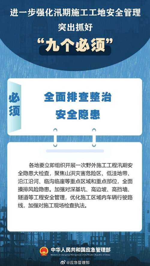 7月9日,國(guó)家防災(zāi)減災(zāi)救災(zāi)委員會(huì)辦公室印發(fā)緊急通知,進(jìn)一步強(qiáng)化汛期施工工地安全管理,要突出抓好“九個(gè)必須”↓↓ ???
