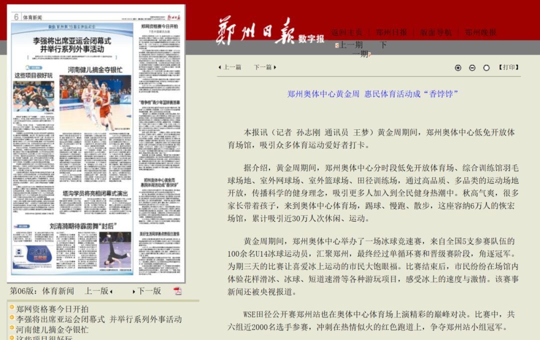 雙節黃金周期間,為豐富廣大市民假期出游選擇,鄭州奧體中心根據群眾喜聞樂見的休閑娛樂活動,充分發揮場館優勢,開展場館低免開放、國際車展、運動賽事等一系列豐富多彩的惠民文體活動,在小長假期間,累計吸引近30萬人次來到鄭州奧體中心打卡精彩活動,受到央視新聞頻道、河南廣播電視臺、鄭州廣播電視臺、鄭州日報等官方媒體爭相報道。