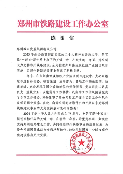 同時,城發集團大力支持鄭州鐵路建設,全力推進鄭州南站及樞紐產業園項目實施,超前謀劃、主動作為,各項工作高效落實、快速推進,充分展現了國企政治站位和責任擔當。做一件好事,添一份美麗 ,再收到鄭州市鐵路建設工作辦公室的感謝信!