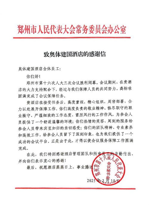 自2021年正式運(yùn)營以來,通過持續(xù)踐行“顧客至上”理念,不斷提升接待水準(zhǔn),打造“奧體服務(wù)”金字招牌,奧體建國酒店已憑借高品質(zhì)服務(wù)成為省、市、區(qū)重大政務(wù)接待活動的首選,并通過2021年中國共產(chǎn)黨第十二次代表大會、2025年鄭州市第十六屆人民代表大會第三次會議等多次重大會議圓滿保障經(jīng)驗(yàn),成為展示奧體形象、彰顯奧體服務(wù)品質(zhì)的一張靚麗名片。