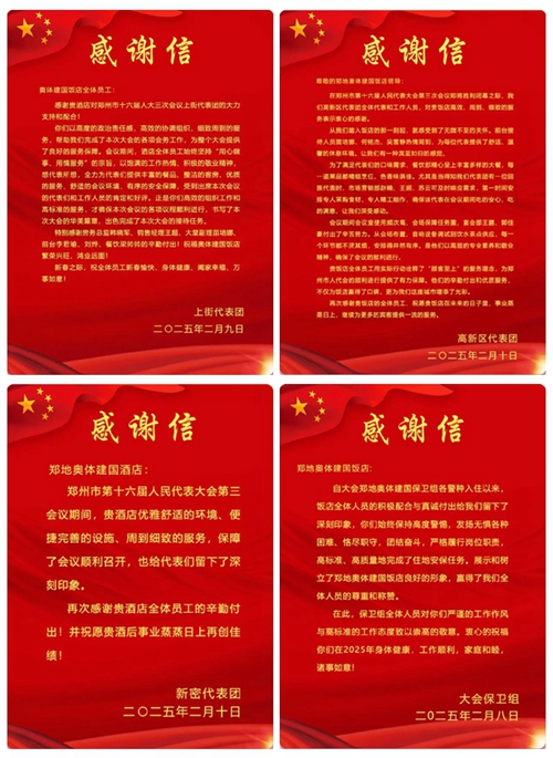 2025年2月10日,鄭州市第十六屆人民代表大會第三次會議第二次全體會議勝利閉幕。鄭州城市發(fā)展集團(tuán)旗下河南鄭地奧體建國飯店作為本次大會的駐地保障酒店,以“五星”服務(wù)標(biāo)準(zhǔn)(環(huán)境舒心、食宿貼心、細(xì)節(jié)暖心、保障安心、文化潤心),圓滿完成了各項(xiàng)接待任務(wù),贏得了與會代表和會務(wù)組的一致好評。