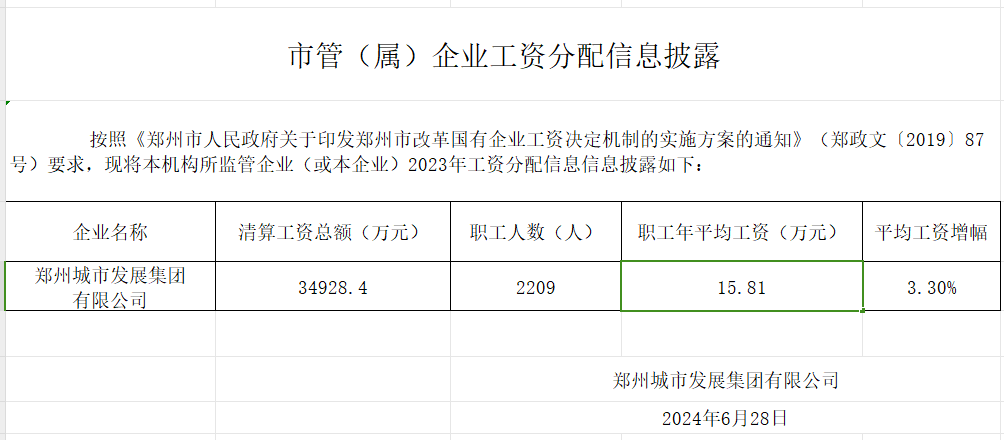 鄭州城市發(fā)展集團有限公司2023年薪酬情況