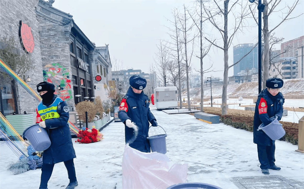 為保障亳都·新象街區安全運行,商都發展公司提前部署應對舉措。備足除雪物資,組織物業連夜掃雪除冰;通過商戶群、街區循環廣播推送防寒防凍、防滑提醒;安排工程人員對設施設備做足保溫防護,全方位排查隱患,為商戶與市民筑牢安全屏障。