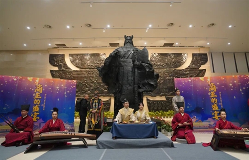 當(dāng)晚,博物院不再是靜默的展廳,而化身為穿越時空的舞臺。以莊嚴(yán)的商湯雕像為背景,古器樂節(jié)目《商王的盛宴》奏響,悠揚(yáng)古樂聲中,商湯與民同宴、祈求順?biāo)斓臍v史場景再現(xiàn)眼前,令人恍若穿越三千年。