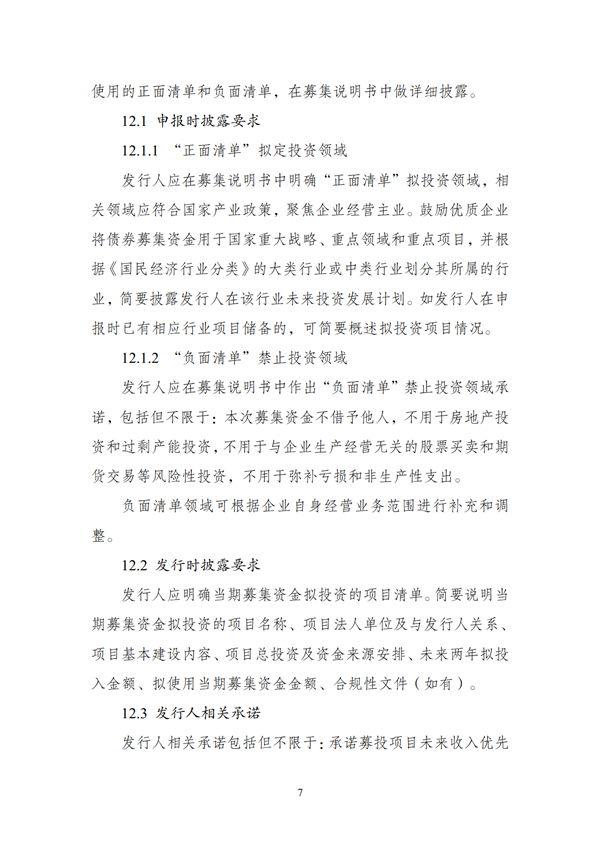 (二)申報(bào)材料應(yīng)明確債券募集資金禁止投向領(lǐng)域,形成“負(fù)面清單”。“負(fù)面清單”包括但不限于:將募集資金借予他人,用于房地產(chǎn)投資和過剩產(chǎn)能投資,用于與企業(yè)生產(chǎn)經(jīng)營無關(guān)的股票買賣和期貨交易等風(fēng)險(xiǎn)性投資,用于彌補(bǔ)虧損和非生產(chǎn)性支出。“負(fù)面清單”領(lǐng)域可根據(jù)企業(yè)自身經(jīng)營業(yè)務(wù)范圍進(jìn)行補(bǔ)充和調(diào)整。