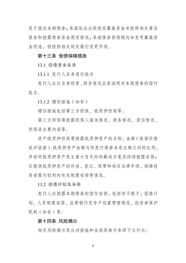 (二)發(fā)行人應(yīng)按照監(jiān)管部門和交易場(chǎng)所的規(guī)定,在存續(xù)期內(nèi)定期披露財(cái)務(wù)情況、經(jīng)營情況、募集資金使用情況、項(xiàng)目進(jìn)展情況等相關(guān)信息。如存續(xù)期內(nèi)變更募集資金用途或發(fā)生其他對(duì)債券持有人權(quán)益有重大影響的事項(xiàng),應(yīng)符合相關(guān)法律法規(guī)和政策要求,按照有關(guān)規(guī)定或約定履行程序,并及時(shí)公告。